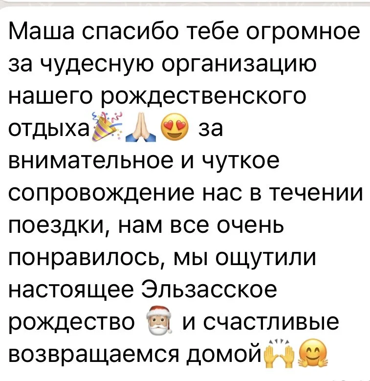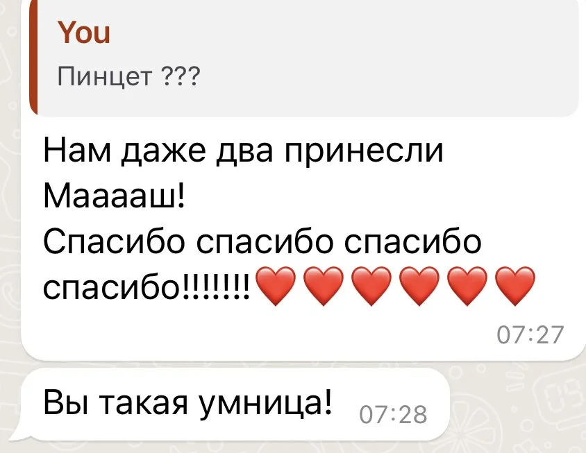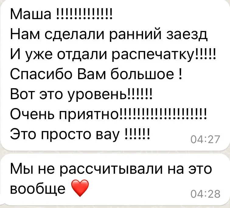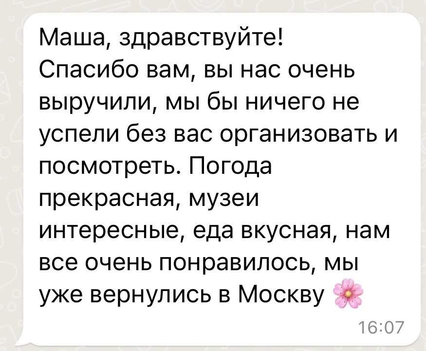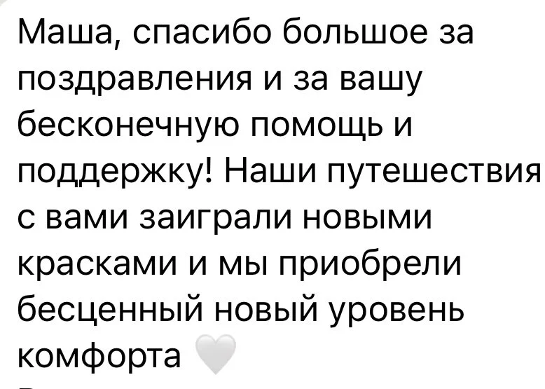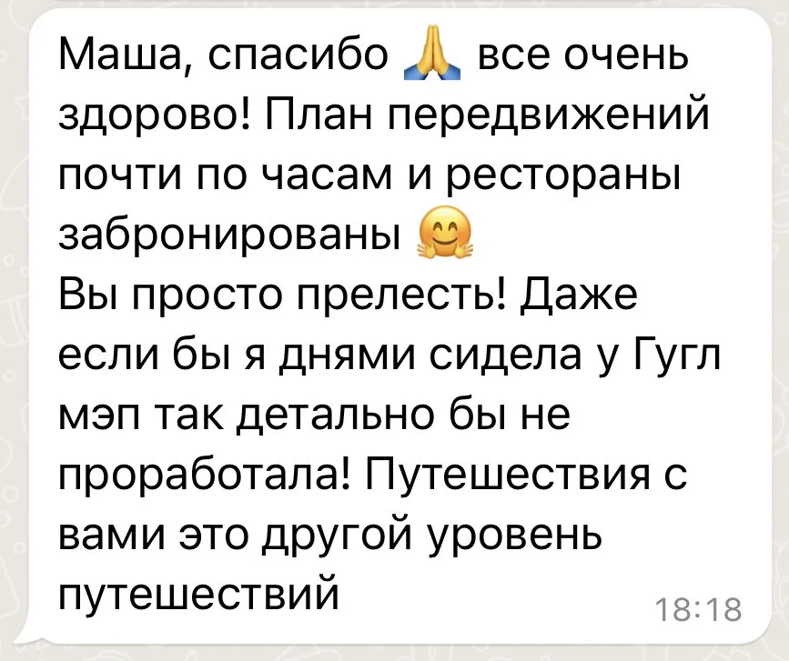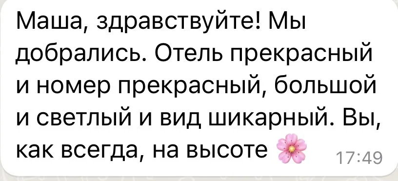 “Маша смогла уговорить наших несговорчивых отельеров сделать бесплатный поздний чек-аут, тем самым сэкономив нам кругленькую сумму и еще раз оправдав свои услуги в тысячный раз.”